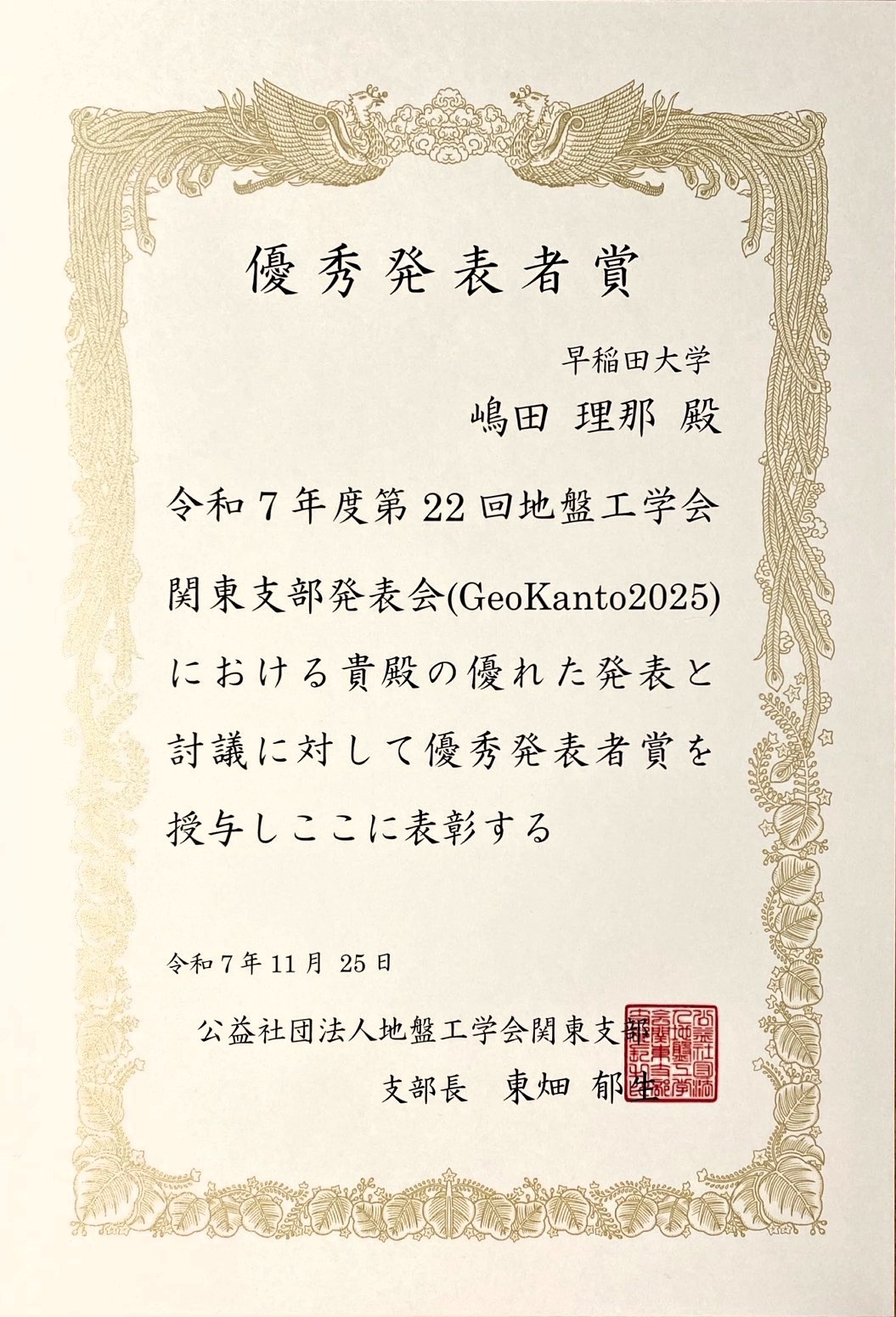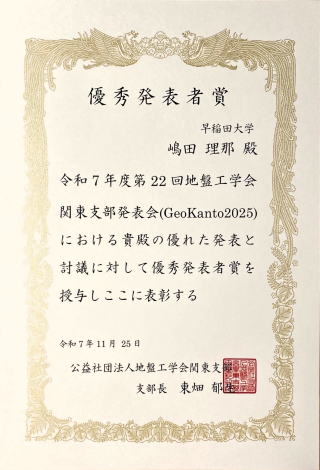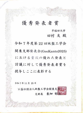 | 地盤工学会第22回関東支部発表会GeoKanto 2025 優秀発表賞 |