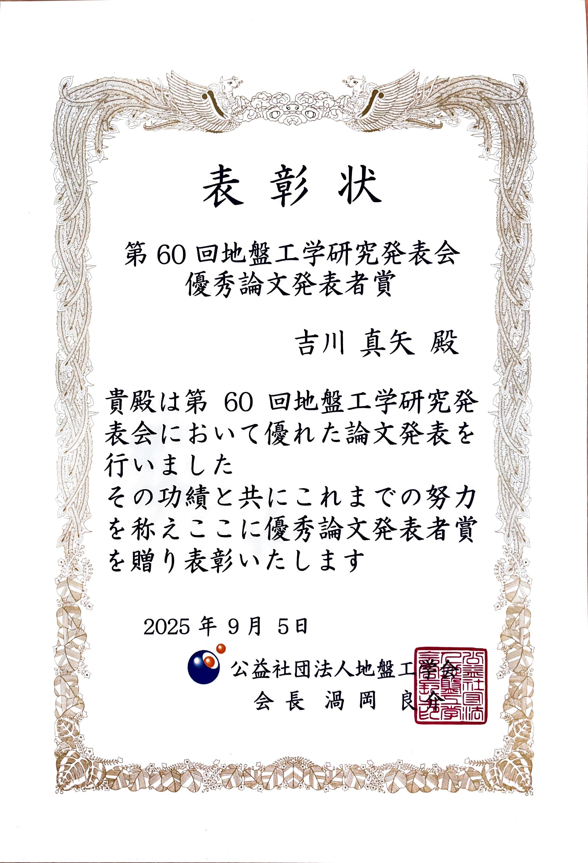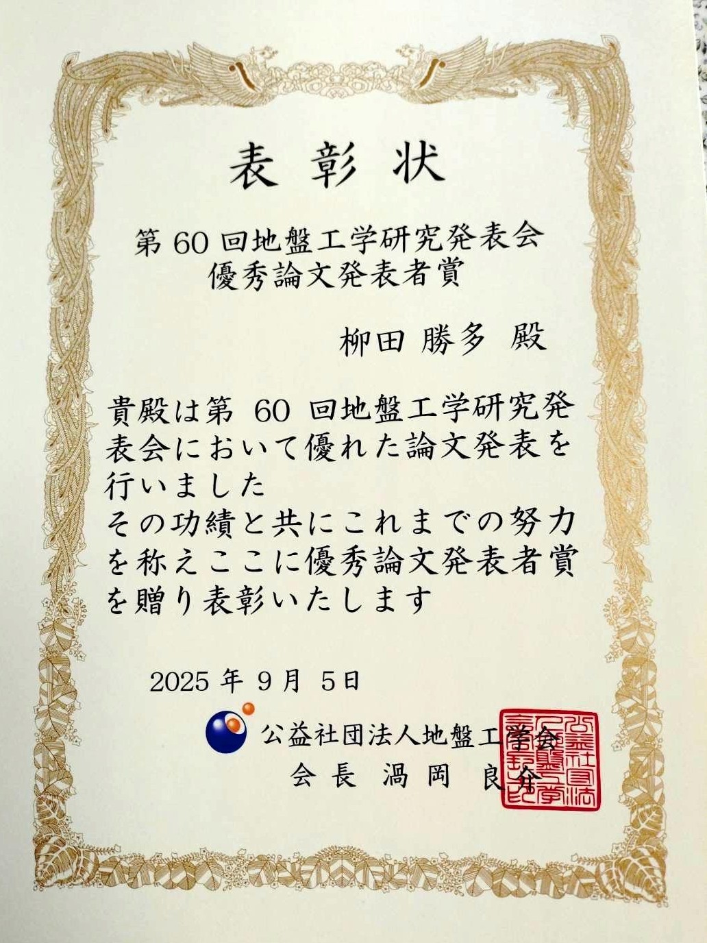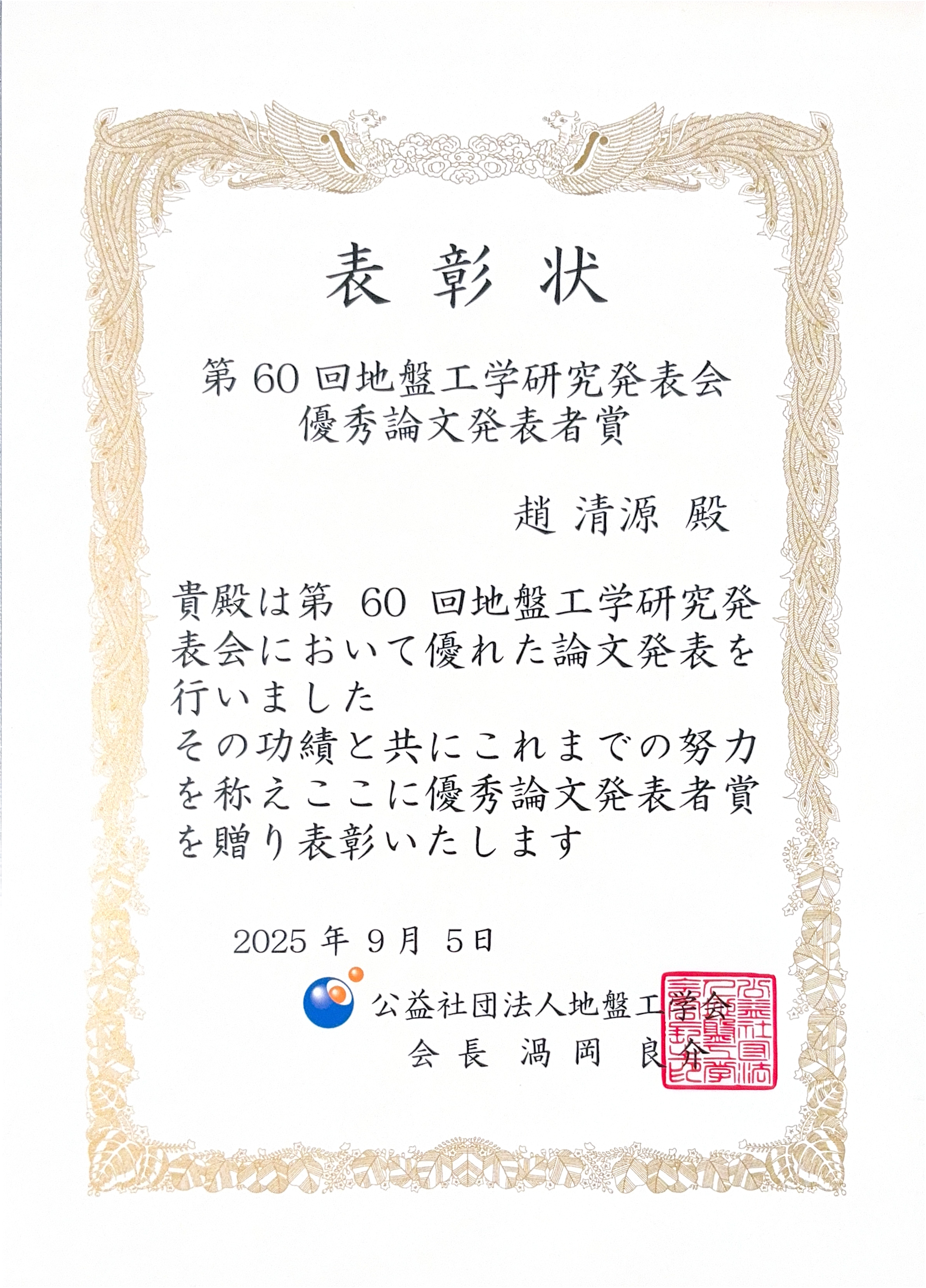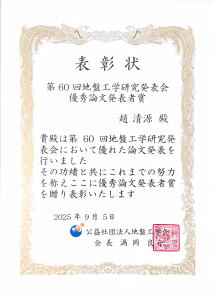 | 第60回地盤工学研究発表会 優秀論文発表者賞 | Qingyuan ZHAO (D1) |