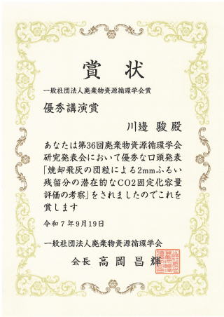 | 鈴木陽也(D2) | 遊離Caを保有するばいじんにおける保水性とCO2固定化性能の関係(優秀講演者賞) | |